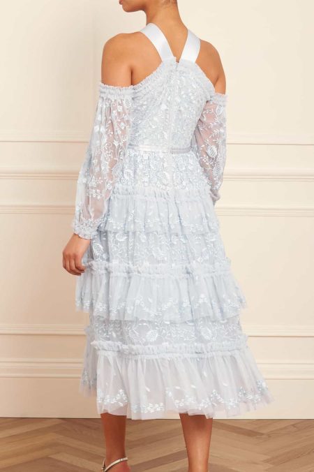 Rent From €115.00Light powder blue off the shoulder with lace tiers Various headpieces available Size uk 16 Perfect for any formal occasion