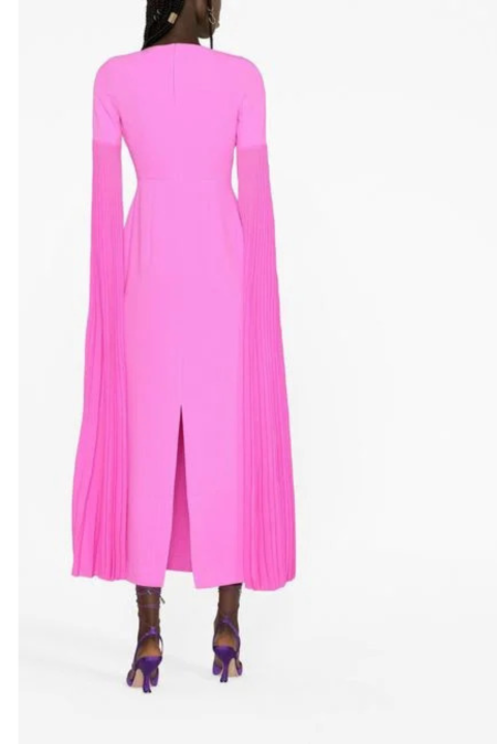 This bright pink midaxi length dress is made of a medium crepe material with full length, accordion pleat sleeve detailing. Smaller fitting