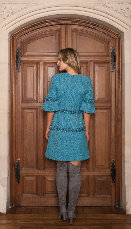 • Teal blue tweed crown headband with leather flowers and quill detail